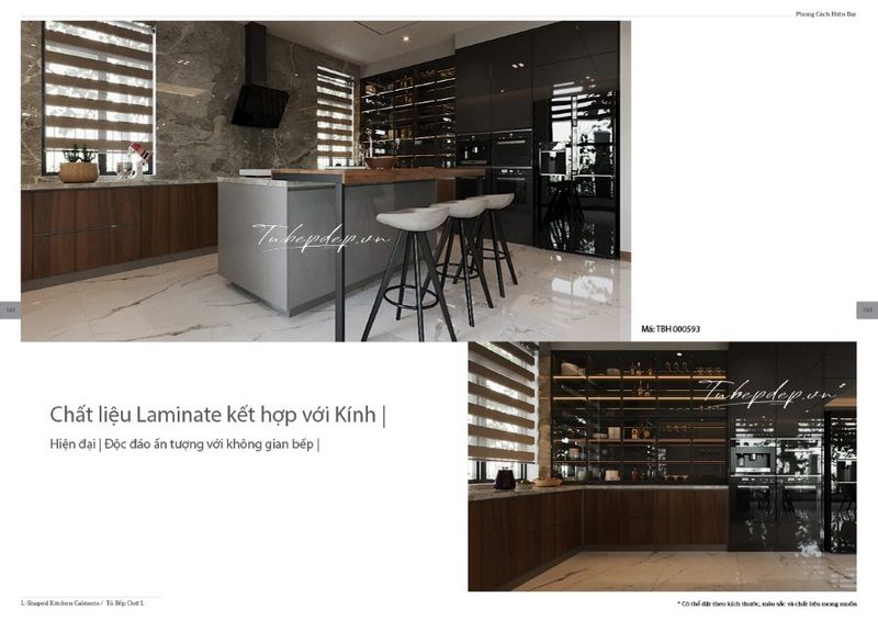 Mẫu tủ bếp mới lạ và trẻ trung dành cho biệt thự, nhà phố hiện đại đem lại sự tiện nghi và sang trọng. Đá ốp bếp được sử dụng cả một khoảng tường lớn đem đến vẻ đẹp trường tồn vượt thời gian