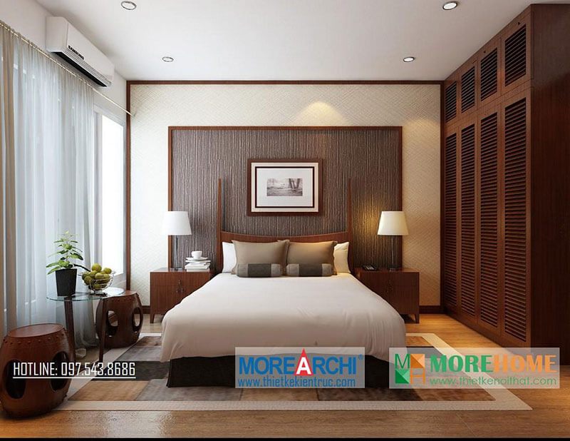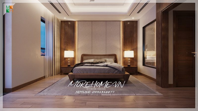 Hai bên tường đầu giường sử dụng gỗ tạo nên điểm nhấn cho phòng ngủ cảm giác mới mẻ. Với táp đầu giường gỗ óc chó hiện đại được đặt đèn ngủ cũng rất thuận tiện cho việc sử dụng của gia chủ mà tính thẩm mỹ lại cao.