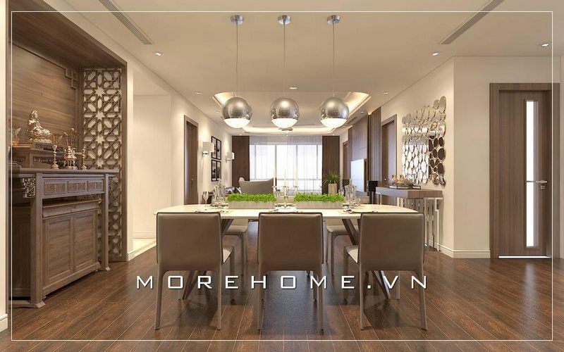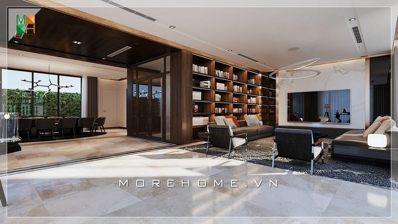 Xu hướng thiết kế phòng khách liền phòng ăn rất được ưa chuộng hiện nay. Hệ thống trần giật cấp và đèn chùm được thiết kế và bố trí ở các gian phòng khác nhau, như một cách để phân chia khu vực sinh hoạt