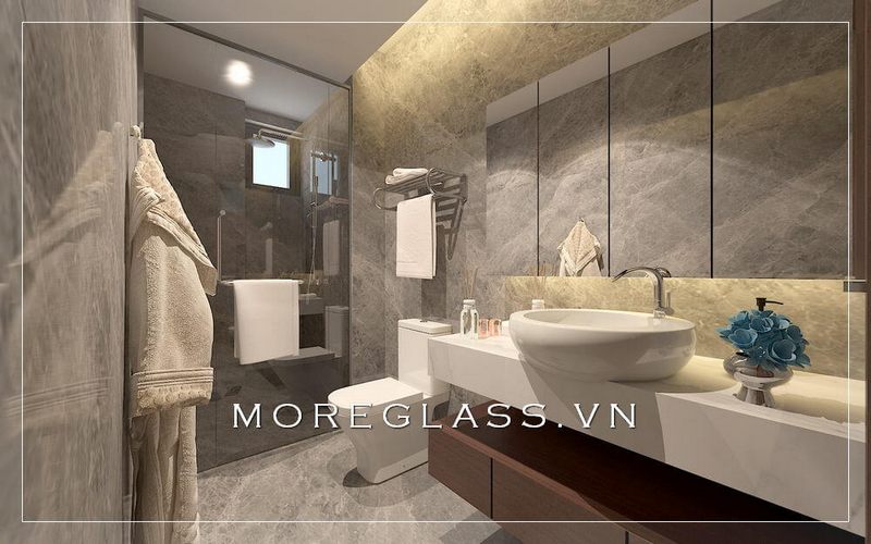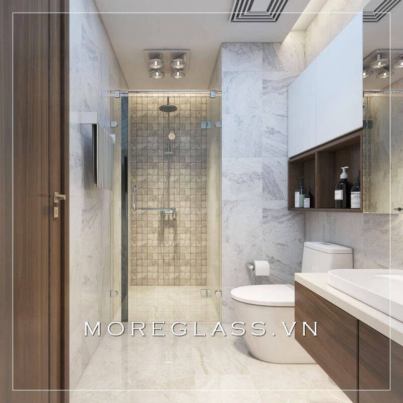 Mẫu nhà tắm kết hợp nhà vệ sinh được ngăn cách bằng vách tắm kính cường lực cao cấp thể hiện sự đẳng cấp và sáng tạo trong thiết kế.