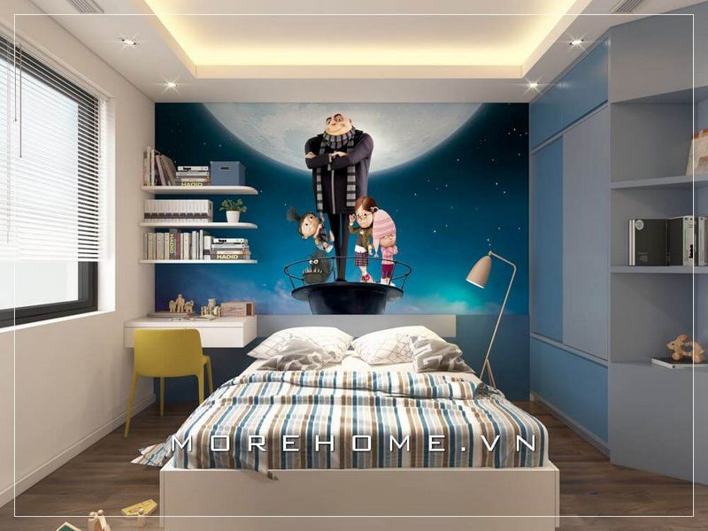Thiết kế nội thất phòng ngủ dành cho con trai độc đáo với mẫu dán tường 3D người ngoài hành tinh sinh động mang lại màu sắc cho phòng ngủ của con