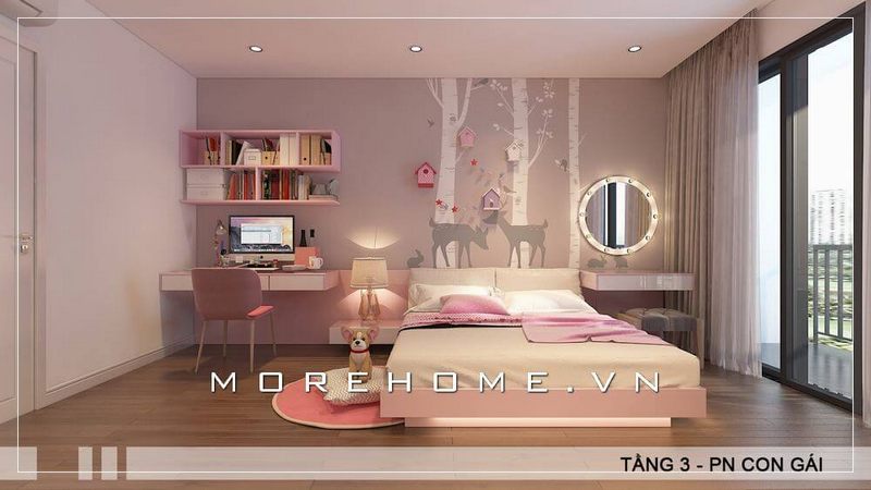 Mẫu bàn trang điểm hiện đại được sử dụng bằng dòng gỗ công nghiệp ốp tường cho phòng ngủ bé gái sinh động và tiện nghi hơn