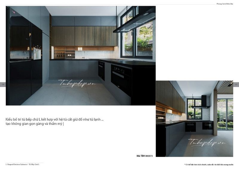 Màu xanh xám độc đáo của mẫu thiết kế phòng bếp hiện đại có tủ bếp thiết kế kịch trần tối ưu không gian và tăng tính thẩm mỹ cho biệt thự, nhà phố
