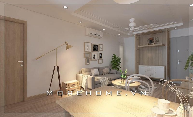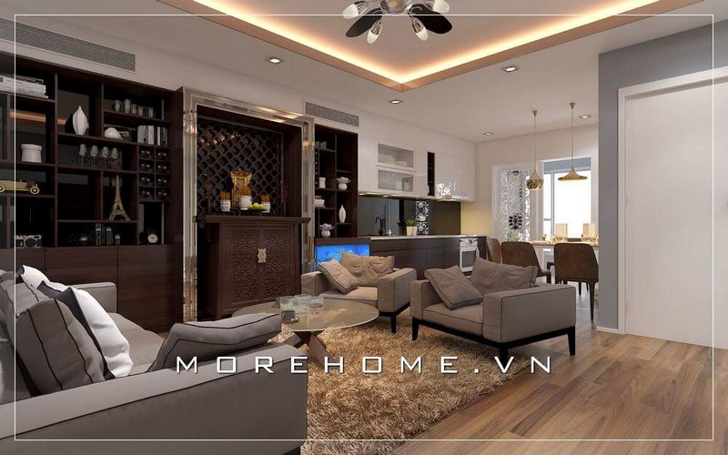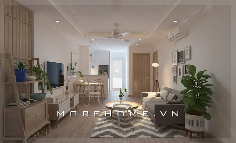 Thiết kế bố cục phòng khách chung cư đơn giản liền phòng ăn và bếp mang đến sự liền mạch, tiện lợi mang phong cách hiện đại.