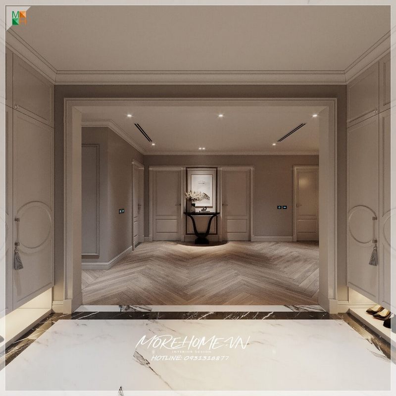 Ở khu vực ra vào, KTS Morehome thiết kế một tủ để đồ bằng gỗ công nghiệp cao cấp, để khách đến chơi có chỗ để cất giữ giày dép, giúp khu vực này luôn được gọn gàng ngăn nắp