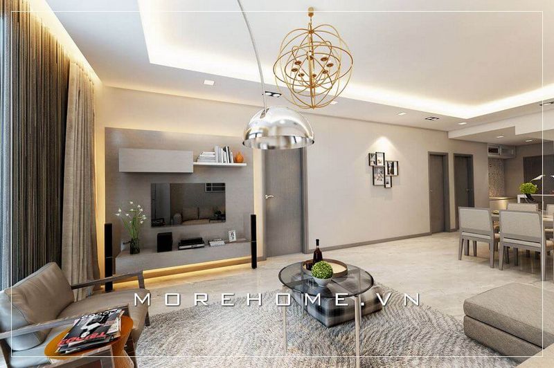 Sự thông thoáng và rộng rãi của phòng khách căn hộ chung cư được nhấn mạnh bởi sự phối màu ghi sáng nhẹ nhàng làm chủ đạo, cùng với cách sắp xếp đồ đạc khoa học hợp lý.