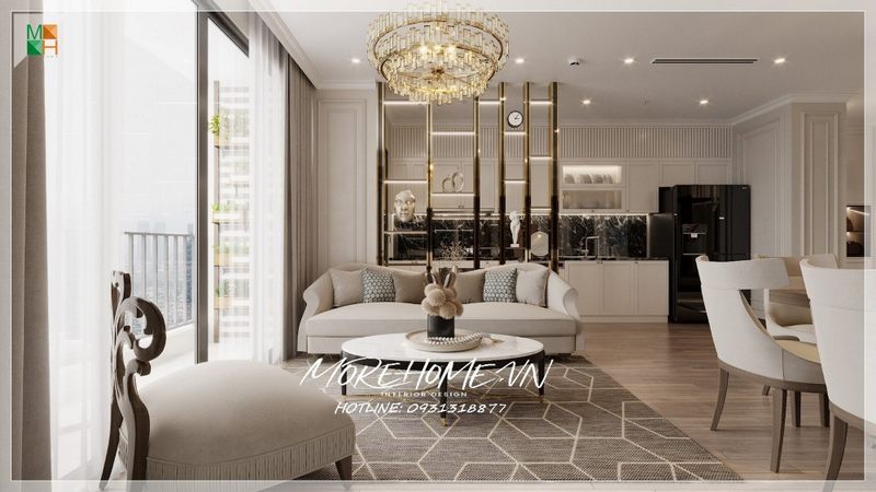 Không gian phòng khách ấn tượng và sang trọng, được trang bị bộ sofa bọc da sắc kem, đồng thời có họa tiết độc đáo cao cấp phong cách thiết kế tân cổ điển tiện lợi, đảm bảo cho căn hộ chung cư của bạn một không gian sống đẹp mắt.
