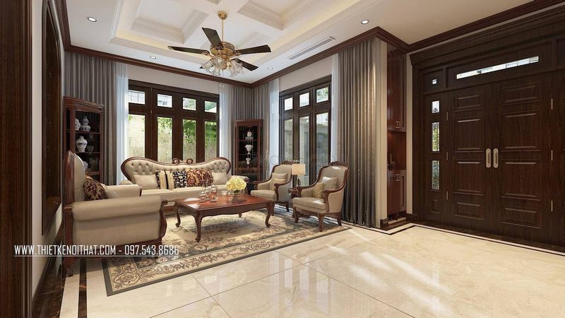 Mẫu cửa gỗ 2 cánh có thiết kế đẳng cấp, màu nâu đồng bộ tạo nên sự liền mạch trong không gian tiếp đón khách của gia chủ.
