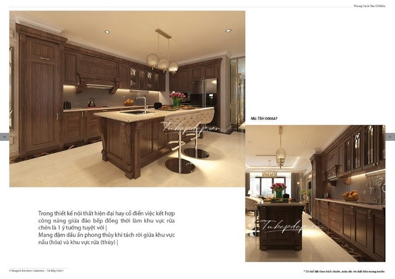 Gợi ý thiết kế phòng bếp đẳng cấp với hệ thống tủ bếp tân cổ điển từ gỗ óc chó nâu sang trọng, phù hợp với các căn hộ, biệt thự, nhà phố.